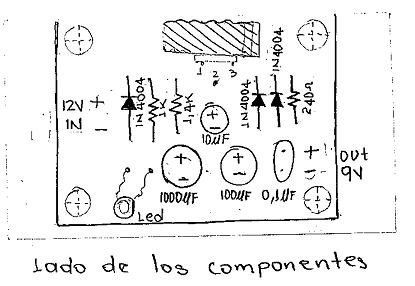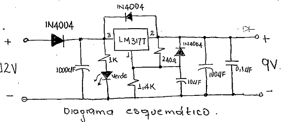 El circuito anterior se diseñó para una salida de 9V (la entrada debe ser mayor que la salida y no se debe exceder los 40V ya que se presentaría avería del regulador) sin embargo para cambiar el nivel de tensión de salida solo basta con cambiar la resistencia de 1.4K conectada al pin 1 (ADJ) del regulador.