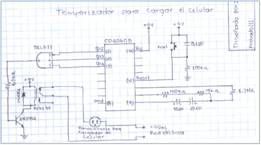 Se construye un circuito temporizado que active el cargador del celular durante un tiempo t1_horas y lo desactive durante t2_horas. El temporizador está configurado para Cargar durante 2 horas y reposar durante 8 horas.