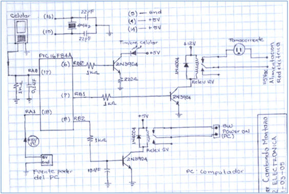 El circuito de la Figura 3 se utiliza para habilitar la tensión de la computadora y da el pulso de encender a la misma: - Habilitar / Deshabilitar la tensión a la computadora es un asunto simplemente por seguridad. ¿Para qué tener la computadora conectada permanentemente a red eléctrica si no es necesario? Mantenerla conectada la hace más vulnerable a un daño por problemas eléctricos. - El mismo microcontrolador, mediante un pulso, simula la acción del humano al presionar el botón de encender de la computadora. Funcionamiento del circuito: El celular local recibe la llamada, aunque el vibrador no está la función sigue habilitada por tanto se aprovechará los 3 voltios que se entregan como pulsos para que sean recibidos por el microcontrolador como presencia de señal de llamada por el pin RA0 (17). La llamada entrante es señalizada a través del led conectado al pin RB0 (6) del microcontrolador. El microcontrolador acciona (pin RB1 (7)) un relevo que permite el paso de la corriente eléctrica (tensión 115 Vac) a la fuente de la computadora. Pasados unos segundos, el microcontrolador da la orden a la Main board de encender, esto lo hace introduciendo un pulso alto seguido de uno bajo al Power On de la Board. Simula cuando el humano presiona el botón de encender. En este momento la computadora ya está encendida y lo que sigue es que la misma inicie el Sistema Operativo (SO).