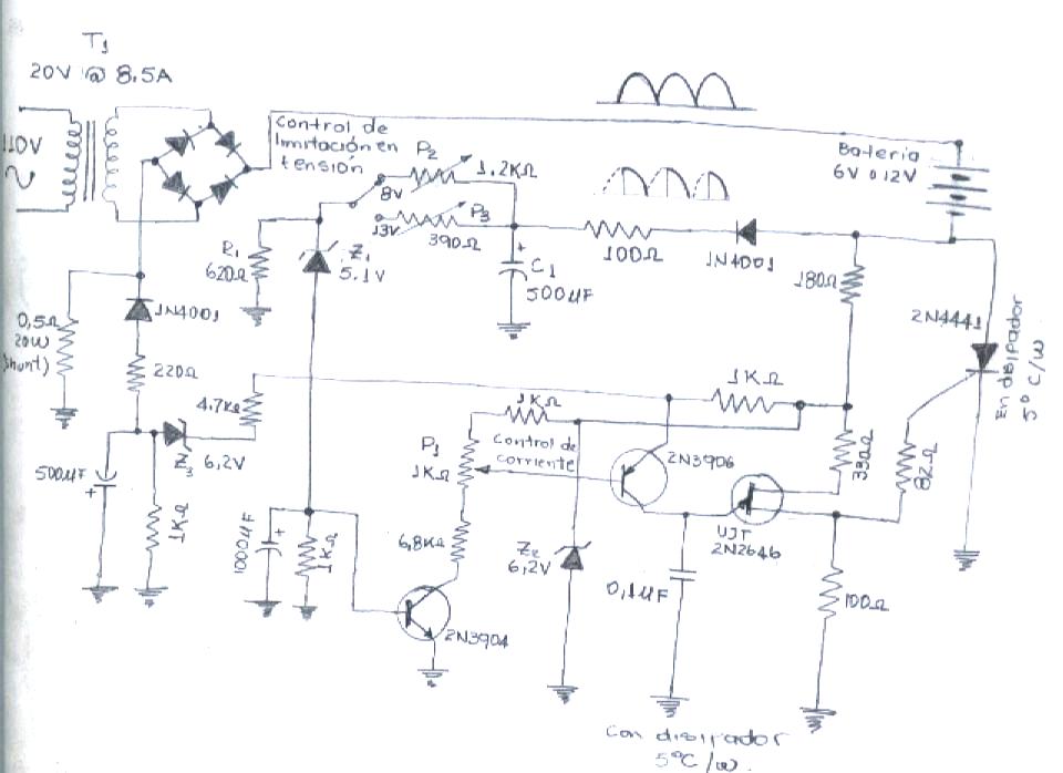 Circuito esquemático La corriente de carga depende del ángulo de abertura del tiristor el cual está gobernado a su vez por el transistor uniunión 2N2646, la fuente de corriente 2N3906 y la tensión de referencia fijada por el potenciómetro P1. El resistor de 0.5Ω (20W) crea una caída de tensión que da una medida de la corriente de carga. Esta tensión se aplica, como realimentación, al generador de corriente 2N3906, constituyendo así la regulación de corriente del cargador. La alimentación en tensión se logra de la manera siguiente: Se considera que la caída media de tensión en el tiristor es mayor cuando la batería está más descargada y tanto menor cuando más cargada esté la batería; el circuito formado por el diodo zener Z1, los potenciómetros P2 y P3, y el resistor R1 y el condensador C1 actúa entonces como detector de tensión. Cuando la batería está cargada la caída de tensión en el condensador C1 será débil y, gracias a los divisores R1, P2 (para 6V) o R1, P3 (para 12V) el zener se bloqueará en cuanto la tensión en los bornes de la batería sobrepase el umbral fijado, con lo que el transistor 2N3904 conmutará a cero la referencia de corriente. Las curvas de la figura siguiente, ilustran características de carga, trazadas para diversas intensidades nominales de corriente. las limitaciones de tensión y corriente resultan muy eficaces. La tensión de carga se limita a unos 9V cuando la batería es de 6V y a 15V para el caso de una batería de 12V.