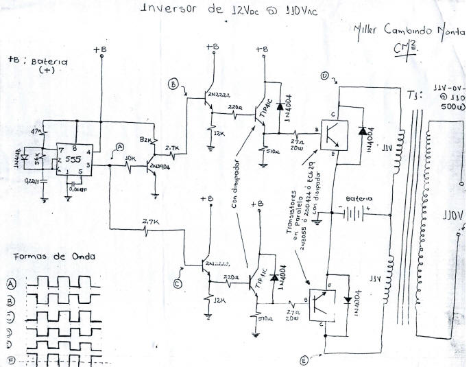 En este circuito se presentan tres etapas: Un oscilador con inversor de onda, preamplificador y Potencia: Oscilador: Es un generador de onda cuadrada de 60 Hz, conformado por un circuito integrado LM555 que con los componentes acoplados (resistencias y capacitores) en este circuito, entrega en su salida (pin 3) una onda cuadrada cuya frecuencia es 60 Hz. La salida del oscilador es derivada (en el punto A) hacia dos ramales, en uno de ellos el pulso es invertido a través del transistor 2N3904 obteniendo así en los puntos B y C una señal desfasada 180° una respecto a la otra. Preamplificador: Realmente se trata de dos preamplificadores (iniciando en los puntos B y C), uno por señal, conformados por transistores 2N2222 seguidos de transistores TIP41C. la función del preamplificador es aumentar en corriente y amplitud la débil señal proveniente del oscilador para luego introducirla a la etapa de potencia del inversor. Etapa de Potencia: En esta etapa la señal proveniente de los preamplifcadores se aumenta en corriente y amplitud, conformada por dos transistores 2N3055 en paralelo por ramal, es la encargada de entregar la señal cuadrada al transformador y este último entregará en su salida 115 V simulados AC, útil para encender electrodomésticos como Televisores, Equipos de sonido, ventiladores, computadores, bombillas incandescentes, entre otros. Batería: Debe ser de 12V, cuanto mayor corriente maneje mejor, puedes utilizar una de 70 AH como las usadas en algunos carros pero si lo que quieres es generar tu energía por largos periodos de tiempo entonces utiliza una batería 8D-1500 o similar que entrega 202 AH. El el circuito, los puntos marcados como +B significa que van conectados al polo positivo de la batería. El Transformador: Debe ser un transformador con derivación (Tap) central, de 11V 0V 11V o similar con capacidad de corriente superior a 3 Amperios. el Tap central del transformador se conecta al polo positivo de la batería como se muestra en el circuito esquemático anterior..