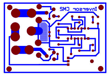 Circuito esquemático En este circuito se utiliza un circuito integrado tipo multivibrador para el oscilador de la corriente alterna. La frecuencia de la señal es de unos 60Hz. en este proyecto se utilizó el circuito integrado SN7400 pero el SN7404 también funciona. La señal del oscilador es conmutada por los transistores TR1 al TR4. TR2 y TR4 son los transistores de conmutación principal. Estos transistores son difícil de conducir cuando se les conecta directamente del Circuito Integrado, su función es amplificar la corriente eléctrica proveniente de TR1 y TR3. La forma de conexión entre TR1 y TR2, y TR3 y TR4 representa una conexión llamada "Conexión Darlington". El transformador para este proyecto es el mismo utilizado en el proyecto anterior (Inversor 12 Vdc @ 120 Vac - CM2). El PCB: Dimensiones 7.5 cm x 5.3 cm (ancho x alto)
