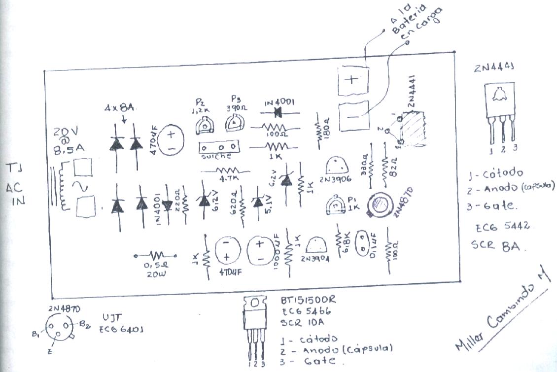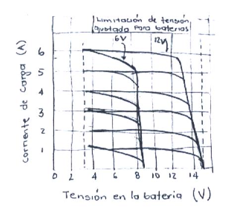 Circuito esquemático La corriente de carga depende del ángulo de abertura del tiristor el cual está gobernado a su vez por el transistor uniunión 2N2646, la fuente de corriente 2N3906 y la tensión de referencia fijada por el potenciómetro P1. El resistor de 0.5Ω (20W) crea una caída de tensión que da una medida de la corriente de carga. Esta tensión se aplica, como realimentación, al generador de corriente 2N3906, constituyendo así la regulación de corriente del cargador. La alimentación en tensión se logra de la manera siguiente: Se considera que la caída media de tensión en el tiristor es mayor cuando la batería está más descargada y tanto menor cuando más cargada esté la batería; el circuito formado por el diodo zener Z1, los potenciómetros P2 y P3, y el resistor R1 y el condensador C1 actúa entonces como detector de tensión. Cuando la batería está cargada la caída de tensión en el condensador C1 será débil y, gracias a los divisores R1, P2 (para 6V) o R1, P3 (para 12V) el zener se bloqueará en cuanto la tensión en los bornes de la batería sobrepase el umbral fijado, con lo que el transistor 2N3904 conmutará a cero la referencia de corriente. Las curvas de la figura siguiente, ilustran características de carga, trazadas para diversas intensidades nominales de corriente. las limitaciones de tensión y corriente resultan muy eficaces. La tensión de carga se limita a unos 9V cuando la batería es de 6V y a 15V para el caso de una batería de 12V.