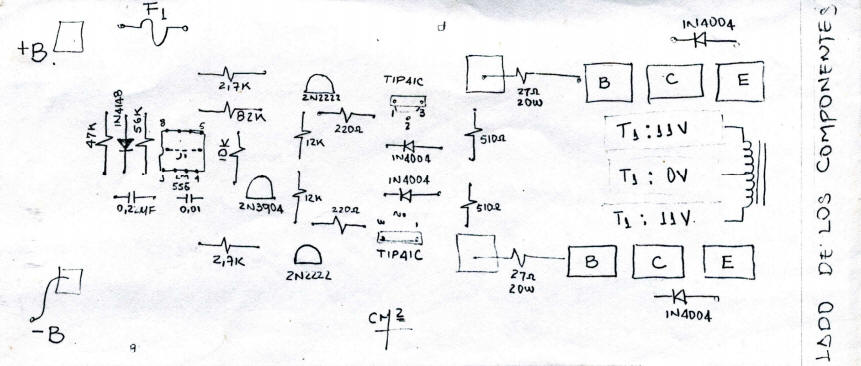 En este circuito se presentan tres etapas: Un oscilador con inversor de onda, preamplificador y Potencia: Oscilador: Es un generador de onda cuadrada de 60 Hz, conformado por un circuito integrado LM555 que con los componentes acoplados (resistencias y capacitores) en este circuito, entrega en su salida (pin 3) una onda cuadrada cuya frecuencia es 60 Hz. La salida del oscilador es derivada (en el punto A) hacia dos ramales, en uno de ellos el pulso es invertido a través del transistor 2N3904 obteniendo así en los puntos B y C una señal desfasada 180° una respecto a la otra. Preamplificador: Realmente se trata de dos preamplificadores (iniciando en los puntos B y C), uno por señal, conformados por transistores 2N2222 seguidos de transistores TIP41C. la función del preamplificador es aumentar en corriente y amplitud la débil señal proveniente del oscilador para luego introducirla a la etapa de potencia del inversor. Etapa de Potencia: En esta etapa la señal proveniente de los preamplifcadores se aumenta en corriente y amplitud, conformada por dos transistores 2N3055 en paralelo por ramal, es la encargada de entregar la señal cuadrada al transformador y este último entregará en su salida 115 V simulados AC, útil para encender electrodomésticos como Televisores, Equipos de sonido, ventiladores, computadores, bombillas incandescentes, entre otros. Batería: Debe ser de 12V, cuanto mayor corriente maneje mejor, puedes utilizar una de 70 AH como las usadas en algunos carros pero si lo que quieres es generar tu energía por largos periodos de tiempo entonces utiliza una batería 8D-1500 o similar que entrega 202 AH. El el circuito, los puntos marcados como +B significa que van conectados al polo positivo de la batería. El Transformador: Debe ser un transformador con derivación (Tap) central, de 11V 0V 11V o similar con capacidad de corriente superior a 3 Amperios. el Tap central del transformador se conecta al polo positivo de la batería como se muestra en el circuito esquemático anterior..