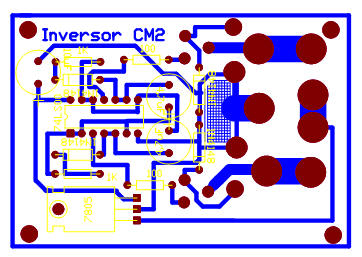 Circuito esquemático En este circuito se utiliza un circuito integrado tipo multivibrador para el oscilador de la corriente alterna. La frecuencia de la señal es de unos 60Hz. en este proyecto se utilizó el circuito integrado SN7400 pero el SN7404 también funciona. La señal del oscilador es conmutada por los transistores TR1 al TR4. TR2 y TR4 son los transistores de conmutación principal. Estos transistores son difícil de conducir cuando se les conecta directamente del Circuito Integrado, su función es amplificar la corriente eléctrica proveniente de TR1 y TR3. La forma de conexión entre TR1 y TR2, y TR3 y TR4 representa una conexión llamada "Conexión Darlington". El transformador para este proyecto es el mismo utilizado en el proyecto anterior (Inversor 12 Vdc @ 120 Vac - CM2). El PCB: Dimensiones 7.5 cm x 5.3 cm (ancho x alto)